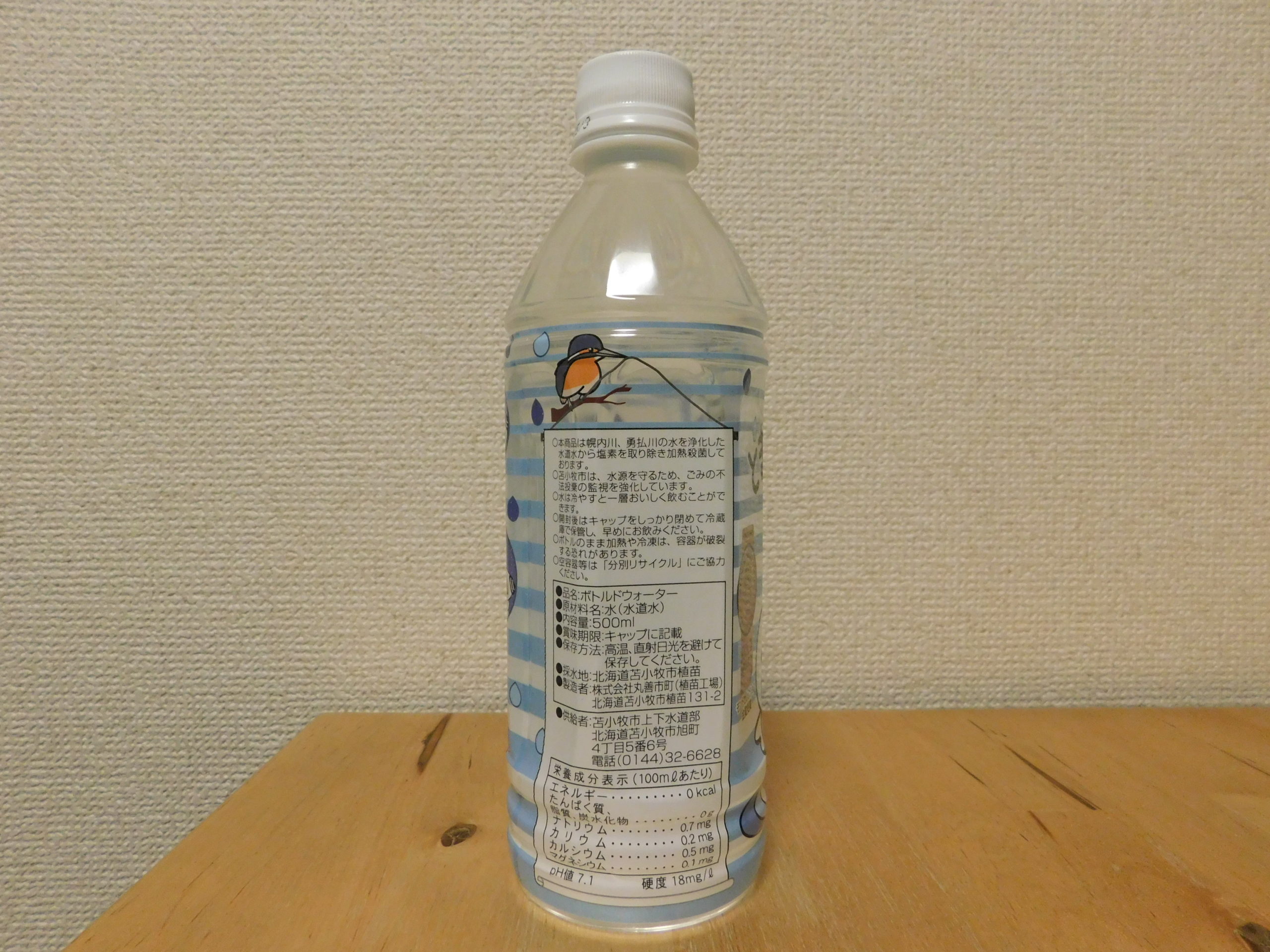 苫小牧のおいしい水 とまチョップ水 苫小牧市上下水道部 苫小牧市 X Facebook0 はてブ0 LINE Pinterest コピー 2020.10.102021.08.31 ペットボトルは吉野工業所製 名称:苫小牧のおいしい水 とまチョップ水 採水国:日本 採水地:北海道苫小牧市植苗 硬度・PH:18・7.1 炭酸の有無:炭酸無し 成分(/1000mL) ナトリウム:7mg カリウム:2mg カルシウム:5mg マグネシウム:1mg 賞味期限:2021年11月5日 品名:ボトルドウォーター 原材料名:水(水道水) 内容量:500ml 保存方法:高温 直射日光を避けて保存してください 供給者:苫小牧市上下水道部 製造者:株式会社丸善市町(植苗工場)